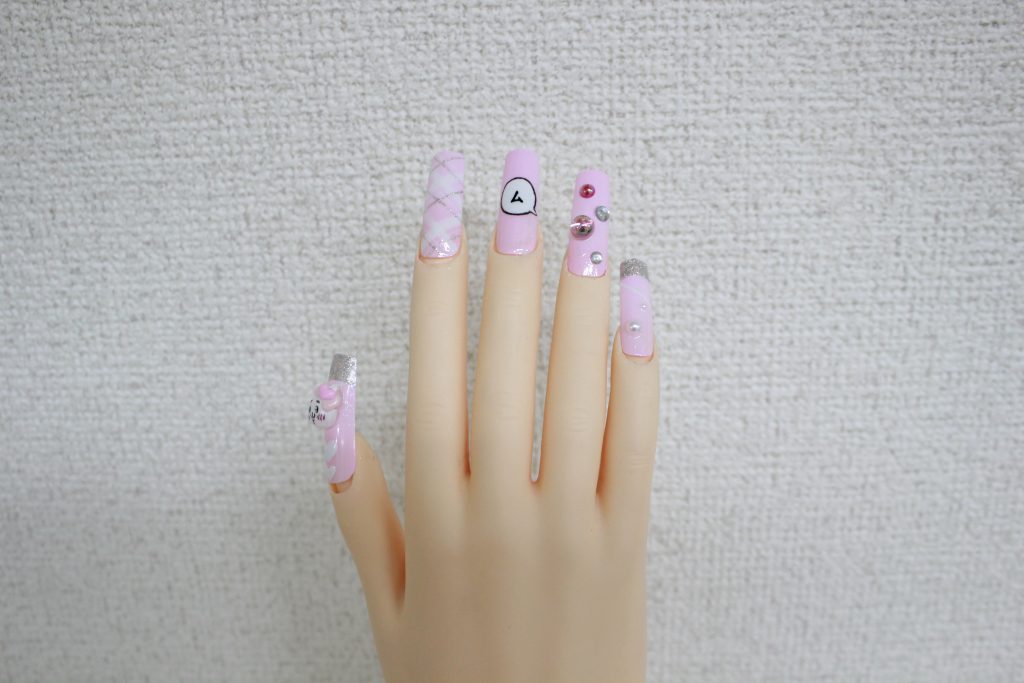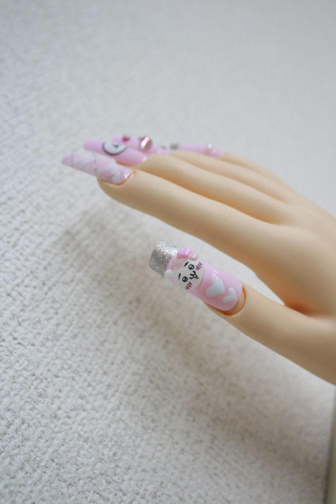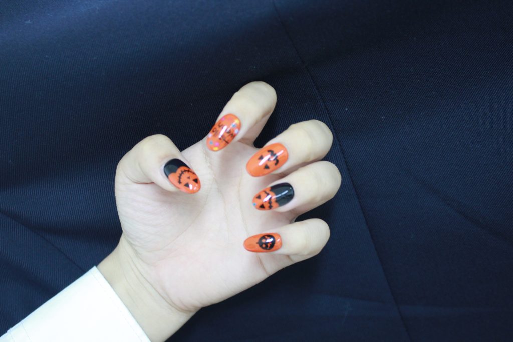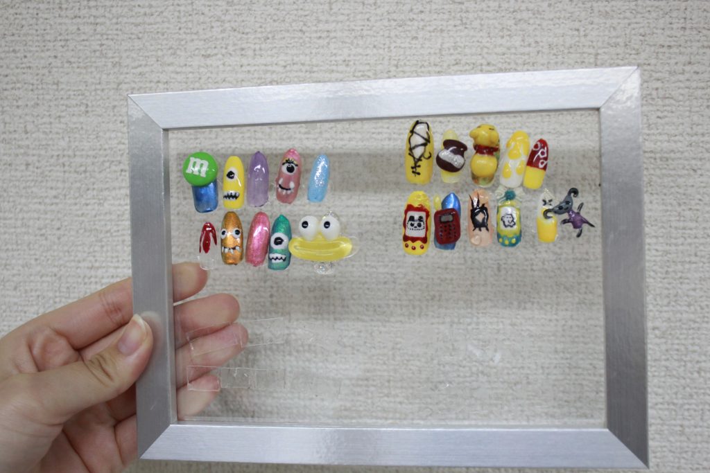 作者からのコメント:左のハロウィンモンスターネイルは、全部のキャラクターの統一感を出しながらも、違う顔に仕上げました。右側のキャラクター詰め合わせネイルはギャル要素を出したいので立体的に仕上げました。下の段の中指にはつけまつげを使用しました。なんと、光を当てると色が変わるパーツも使用しています!