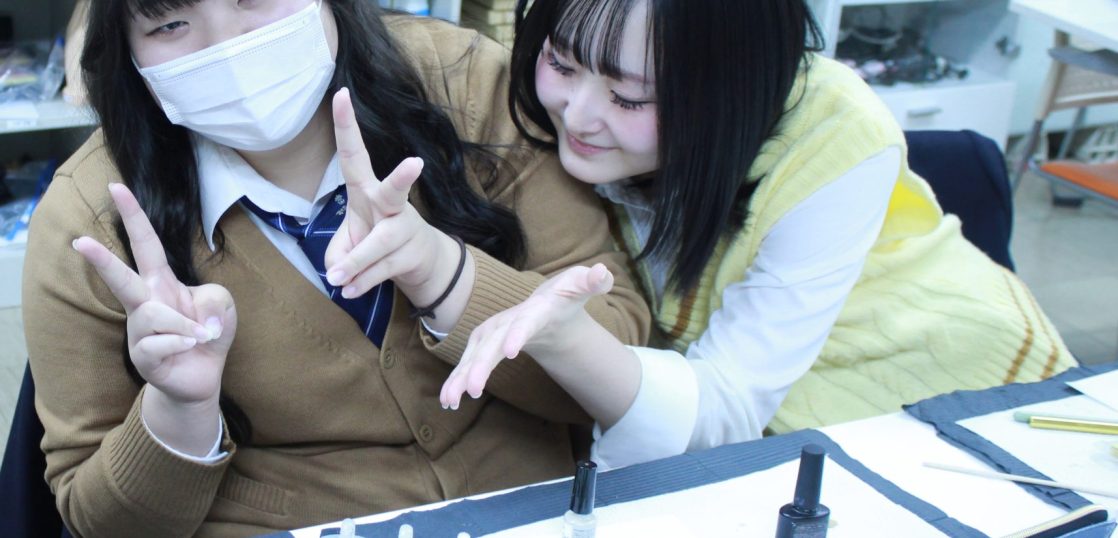 キャラクターのネイルに挑戦する生徒もいました。食べ終わったお菓子の袋を切り取って、パーツにする模様。